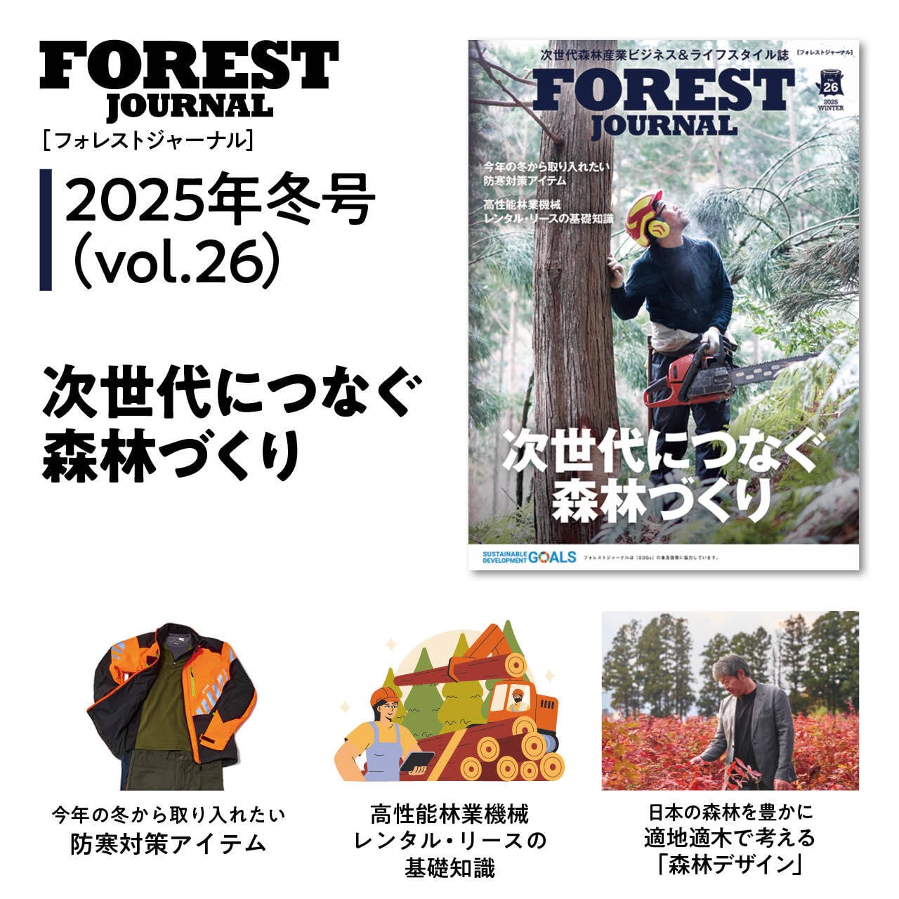 フォレストジャーナルは、次世代を担う林業経営者および若手の林業従事者の方々に向けて、最先端の林業テクノロジーや里山経営術、世界中の森林経営の成功例から、森での日常に役立つファッション&カルチャー情報まで、次世代につながる林業と森林づくりのための情報を発信するフリーマガジン。
